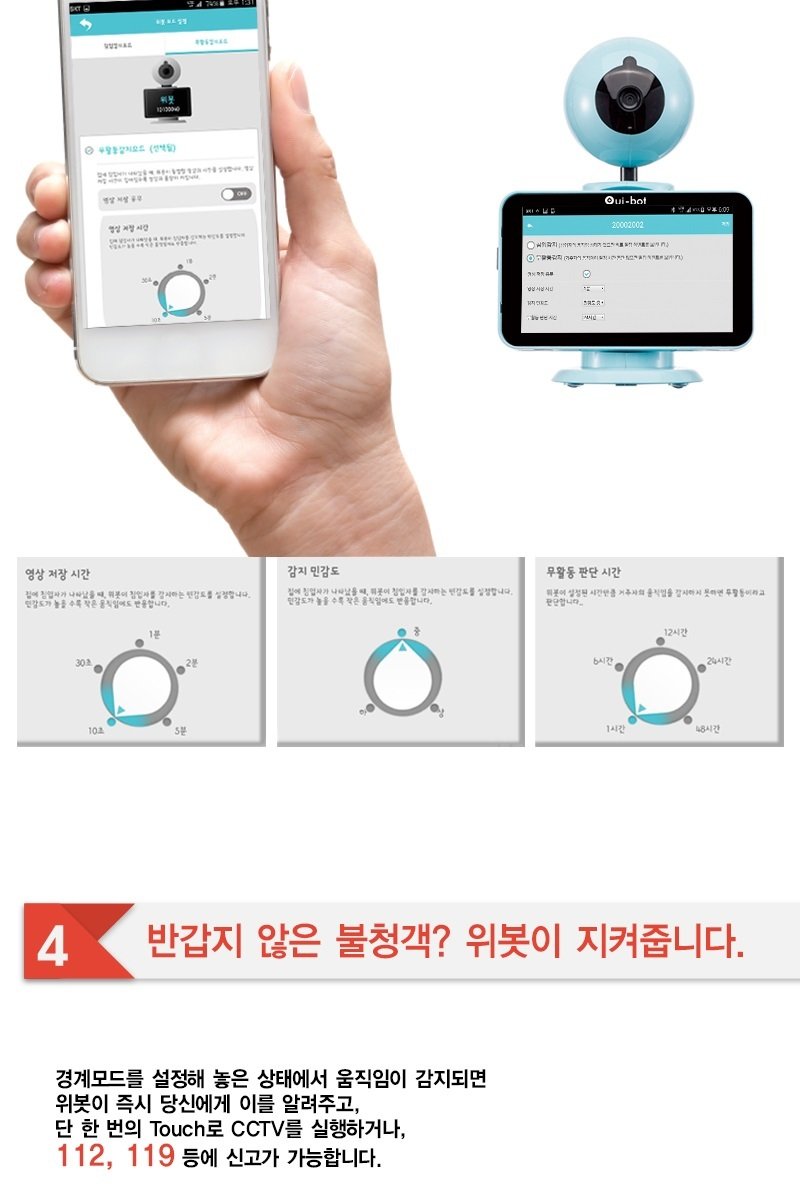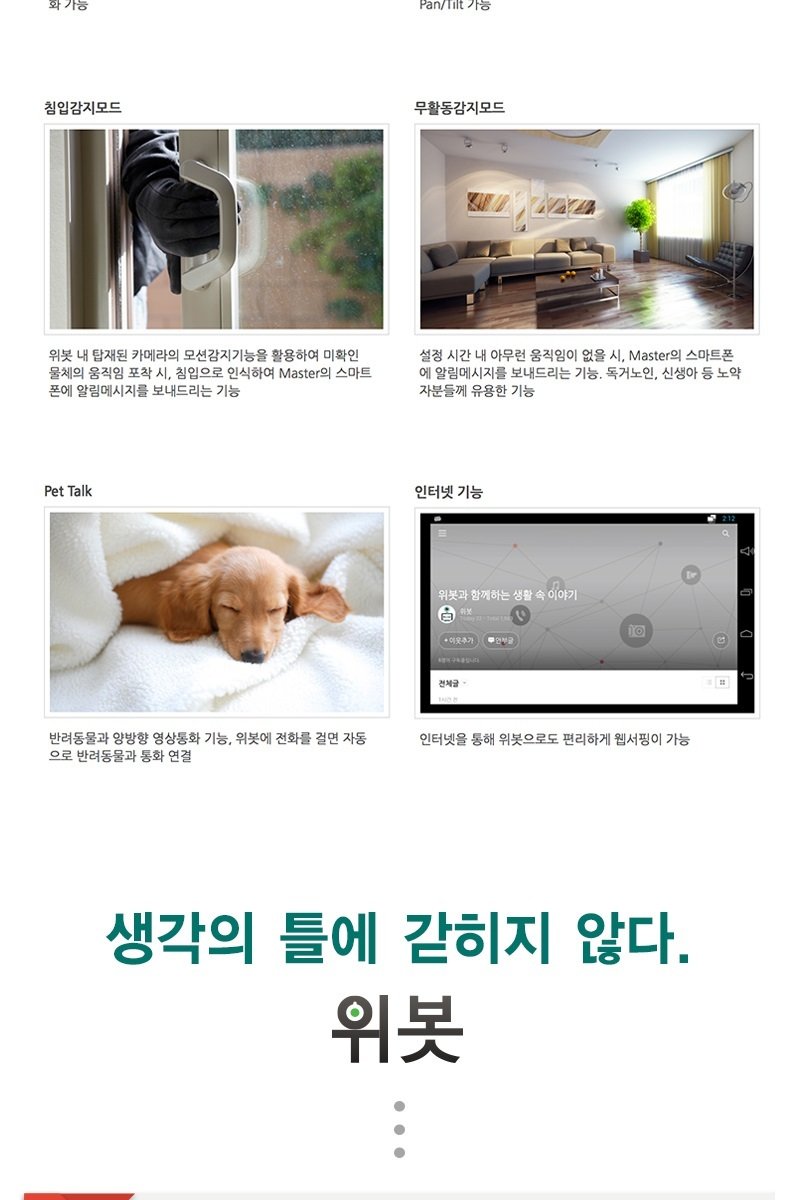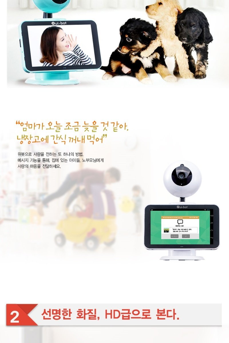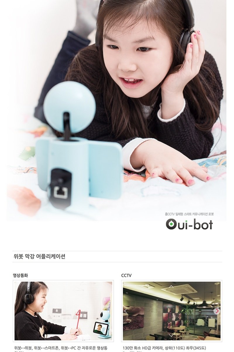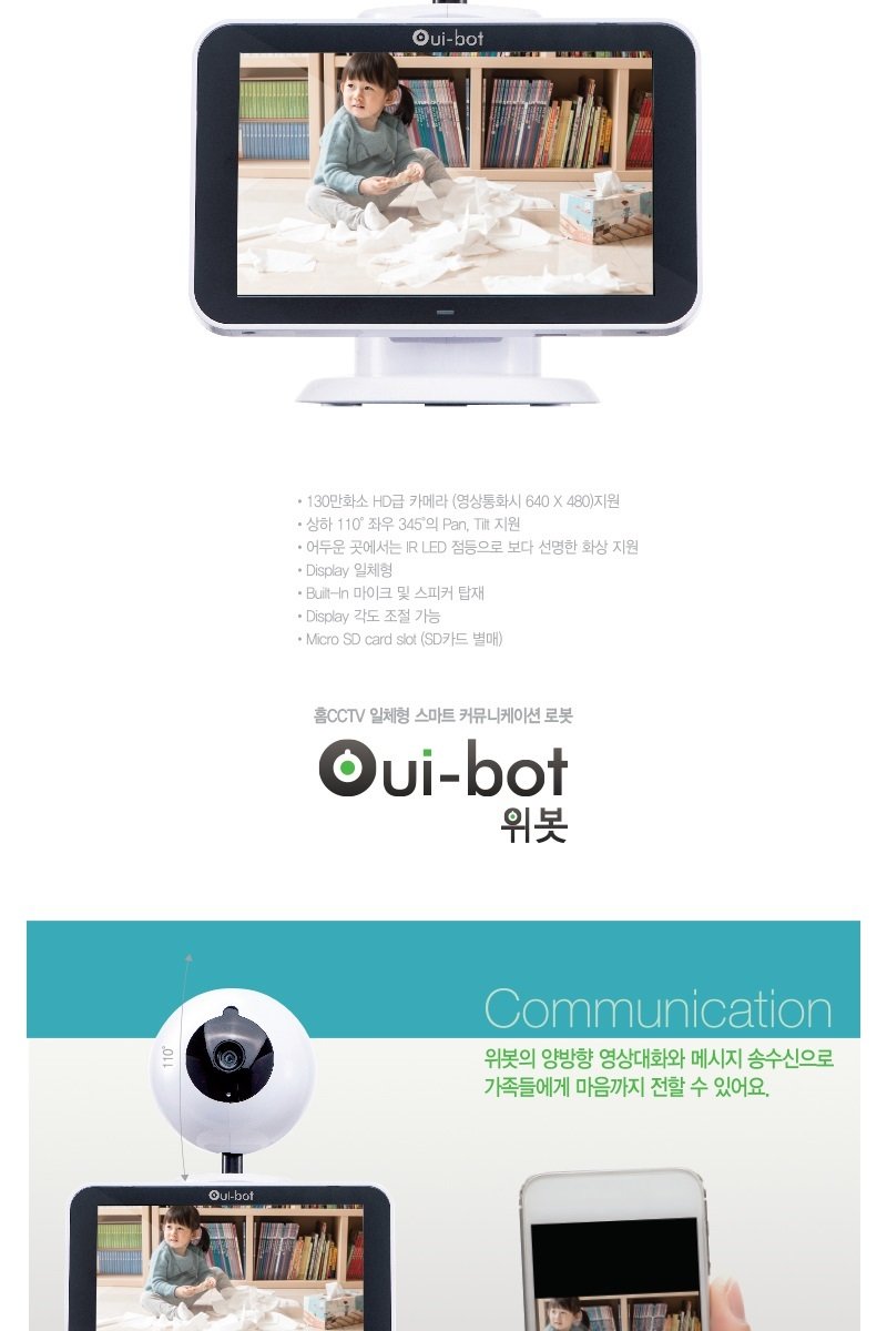 단순 IP카메라와 달리 액정과 안드로이드 보드(board)가 제품 내에 내장되어 있고, 타 제품이 CCTV 모니터링 및 침입탐지의 단순 기능만 제공하는데 반해 양방향 영상통화 / Pet Talk / 텍스트 메시지 송수신 / 위봇간 영상통화 / 음악재생 / 동영상 재생 / 인터넷 서핑 / 무 활동 감지의 놀라운 기능이 함께 탑재되어 있습니다. 따라서 홈CCTV와 홈엔터테인먼트, 홈 communication이 모두 가능한 기기입니다.