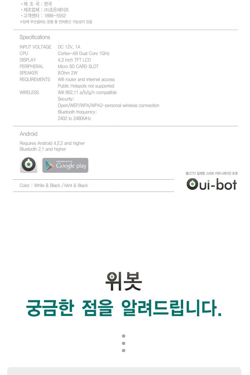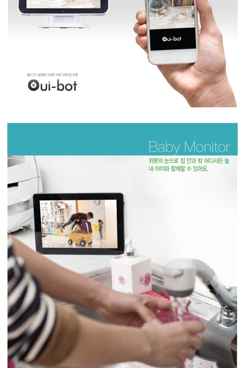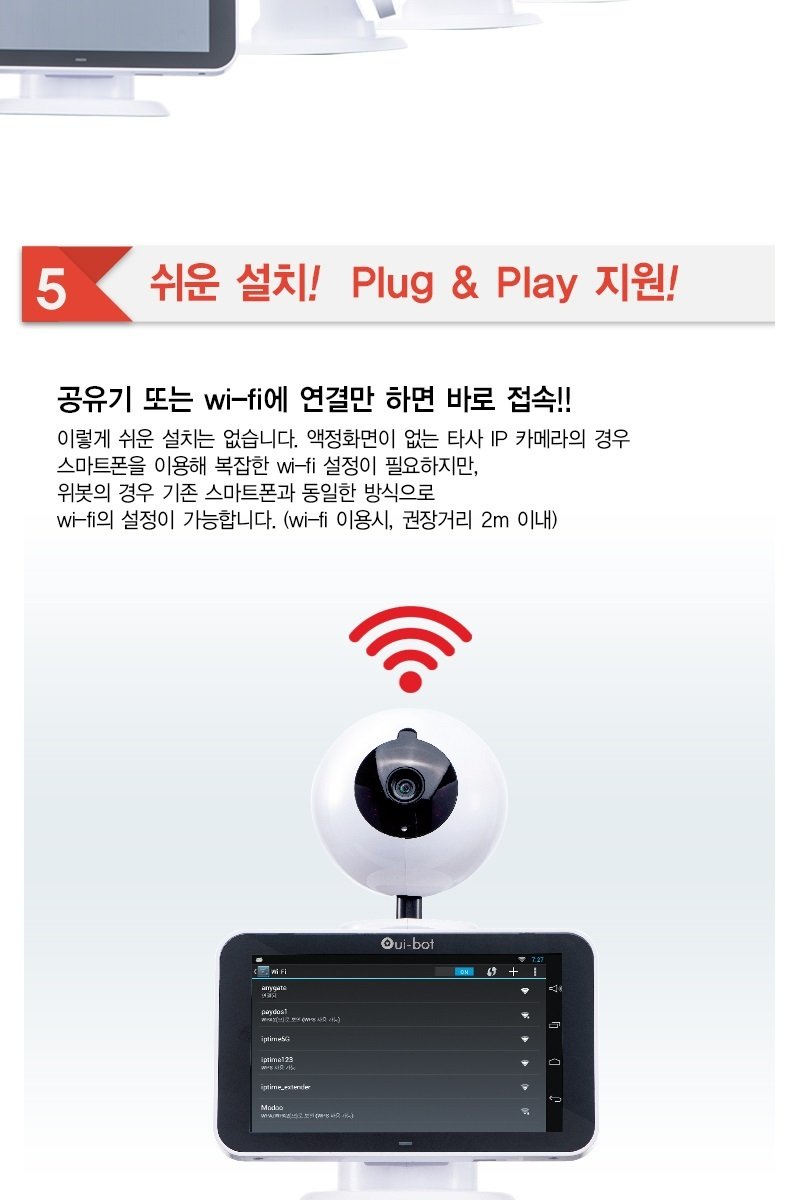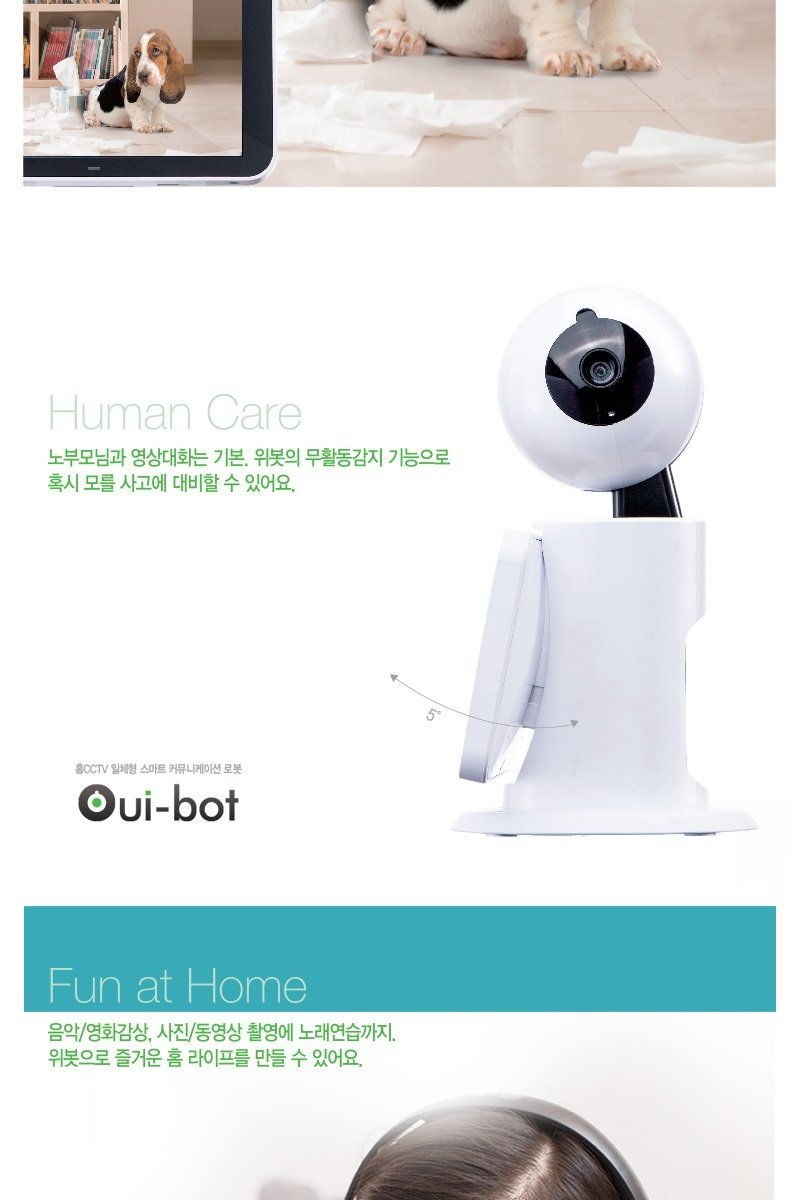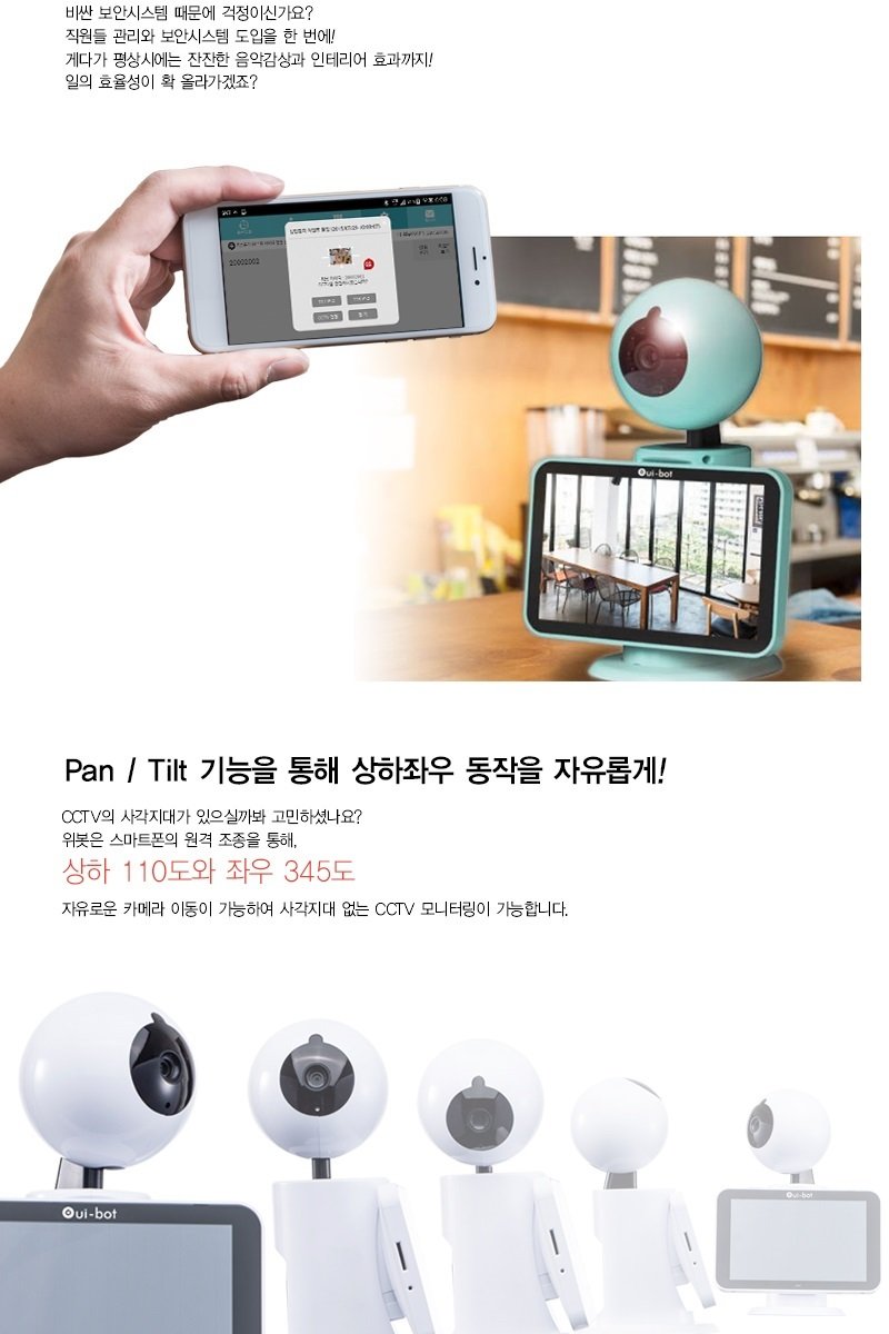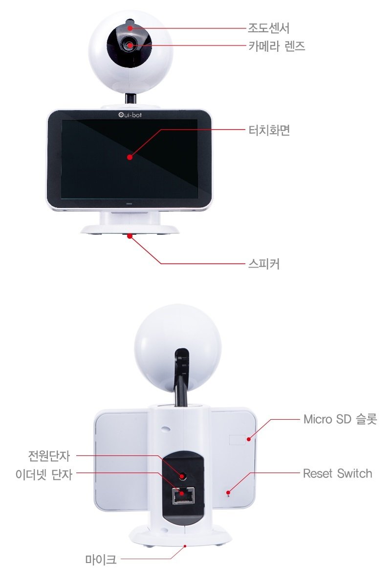 단순 IP카메라와 달리 액정과 안드로이드 보드(board)가 제품 내에 내장되어 있고, 타 제품이 CCTV 모니터링 및 침입탐지의 단순 기능만 제공하는데 반해 양방향 영상통화 / Pet Talk / 텍스트 메시지 송수신 / 위봇간 영상통화 / 음악재생 / 동영상 재생 / 인터넷 서핑 / 무 활동 감지의 놀라운 기능이 함께 탑재되어 있습니다. 따라서 홈CCTV와 홈엔터테인먼트, 홈 communication이 모두 가능한 기기입니다.