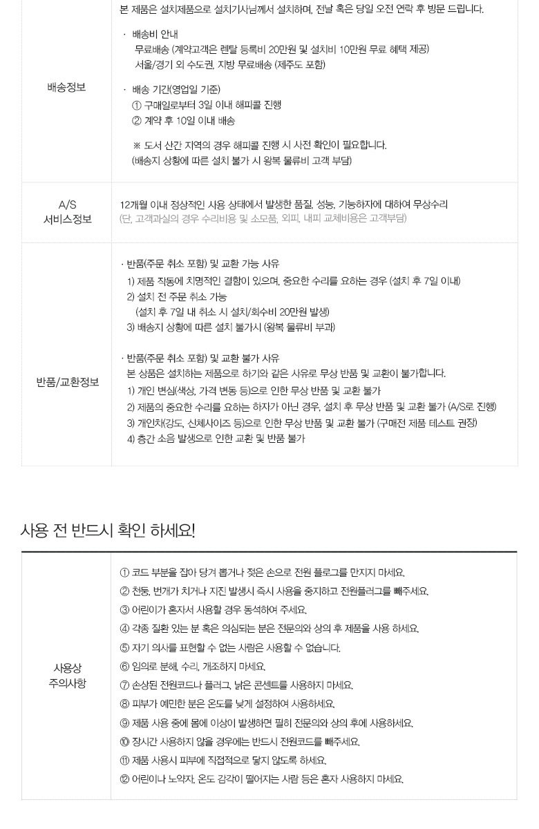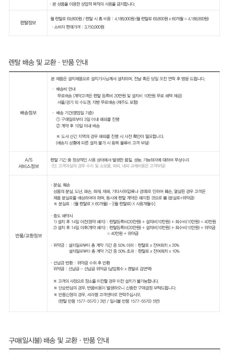 - 결제방법 : 신용카드자동결제,자동계좌이체 / 60개월간 무상 A/S(단 고객과실 제외, ※일시불구매시 12개월)
