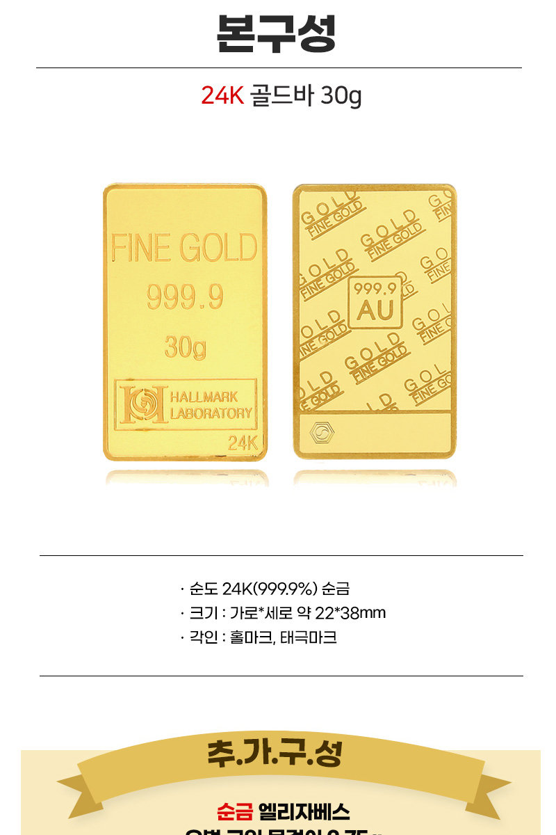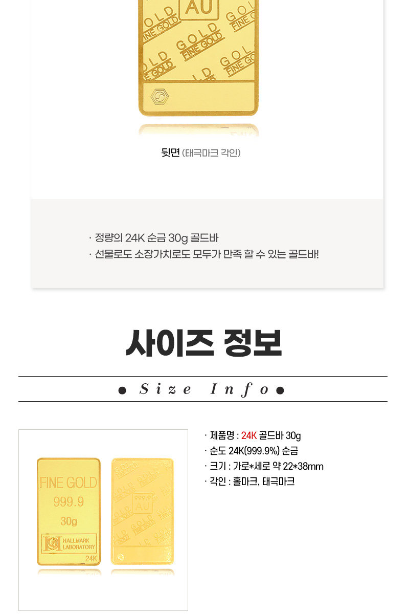 -순도 24K(999.9%) 순금 / 크기 : 가로*세로 - 약 22*38mm / 각인 : 홀마크, 태극마크