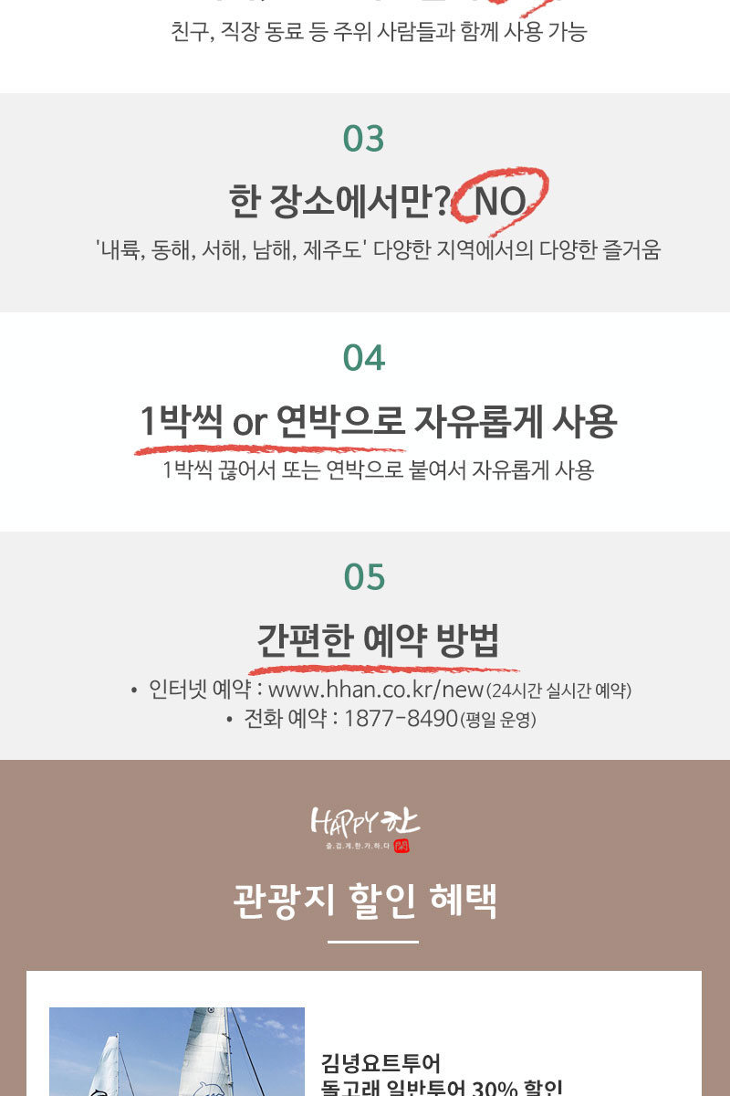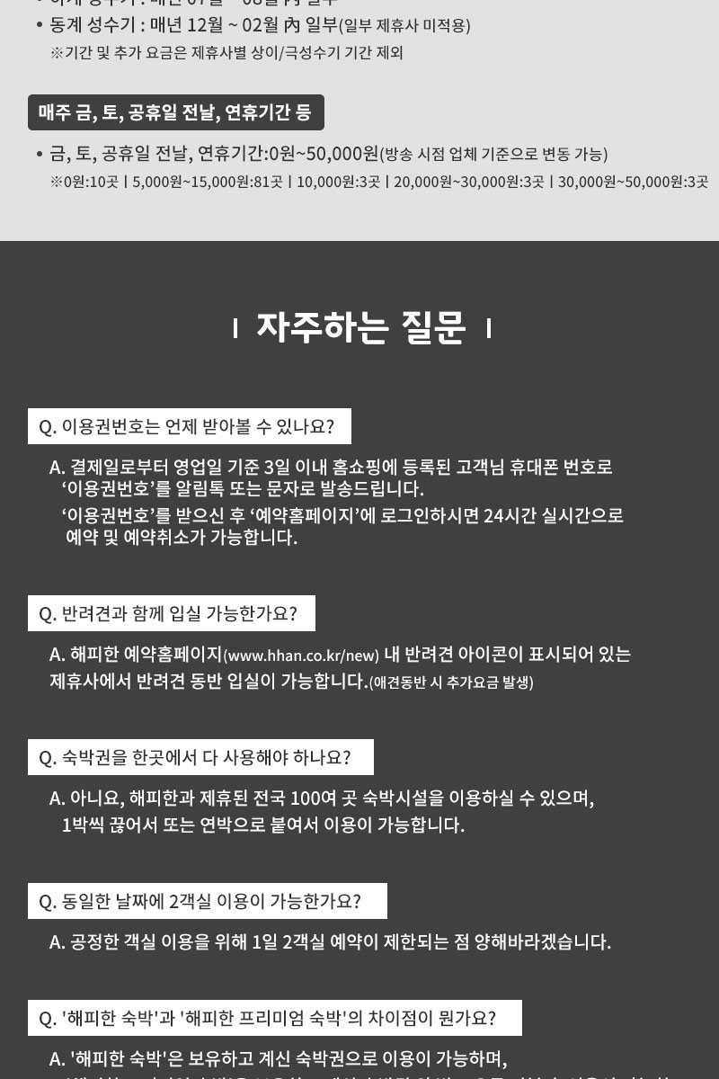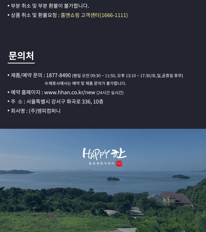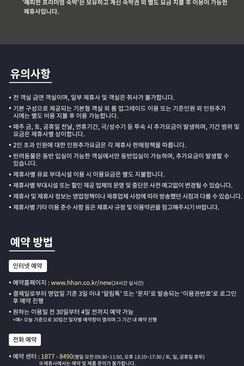 ▶ 제품/예약 문의처 : ‘해피한’자유숙박권 예약 콜센터 1877-8490 (평일 오전 09:30~11:50, 오후 13:10~17:30 / 토, 일, 공휴일 휴무)