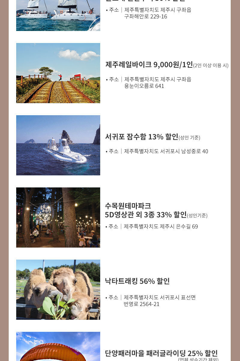 2)[제주]‘수목원테마파크(5D영상관외3종)’, ‘제주레일바이크’, ’낙타트래킹’ 할인제공. (타 할인권 중복 할인 불가)
