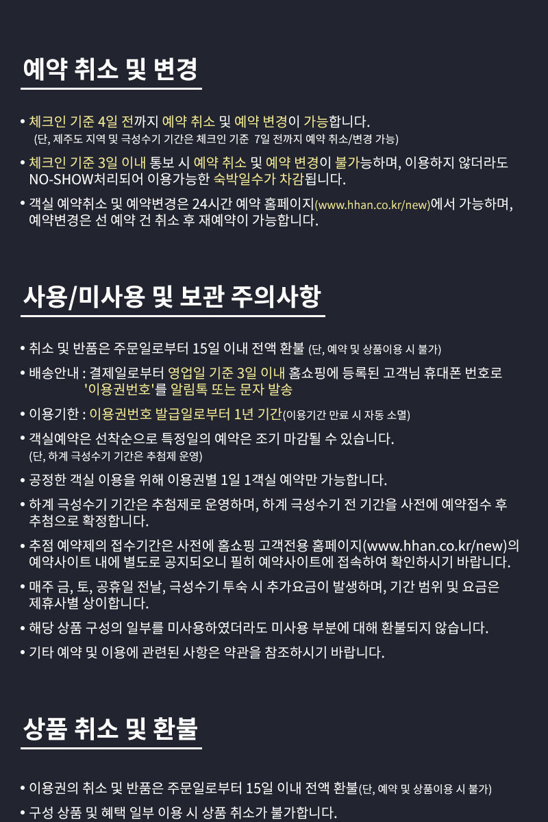 (단, 제주도 지역 및 극성수기 기간은 입실일 7일 전까지 예약 취소/변경 가능)