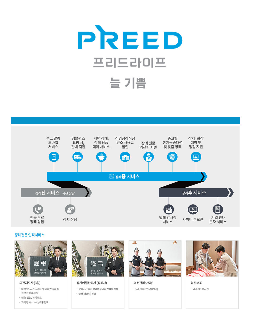 - 프리드라이프 직영 장례식장인 쉴낙원 김포, 인천, 경기, 오산동탄, 세종, 홍천, 남대전 장례식장 이용시 우대 할인 제공됩니다.