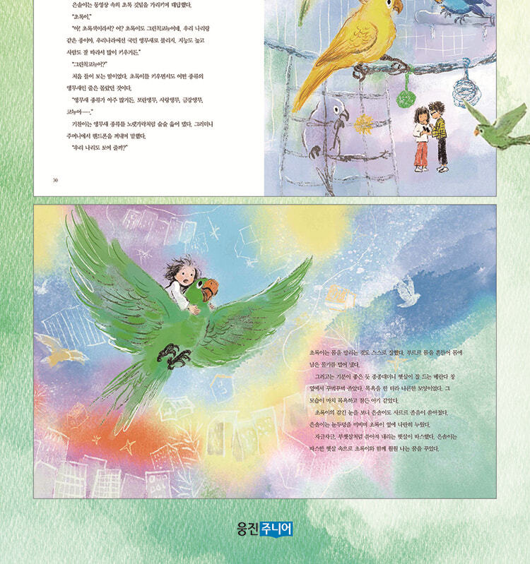 어느 날 갑자기 찾아와 은솔이의 소중한 가족이 된 앵무새 초록이. 함께 울고 웃으며 성장하는 은솔이와 초록이에게 뜻밖의 위기가 찾아온다. 인간과 함께 살려면 날지 못하는 새가 되어야 한다는……. 초록이도, 은솔이도 그 누구도 상처받지 않고 함께 잘 사는 방법은 과연 없는 걸까 초록이와 행복하게 사는 법을 찾기 위해 고군분투하는 은솔이의 푸르른 날갯짓이 시작된다!
