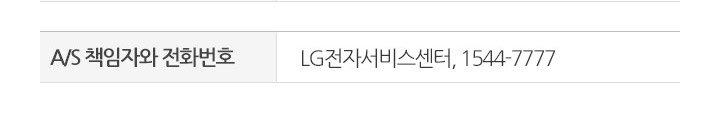 | A/S 책임자와 전화번호 | ① LG전자 서비스 대표전화(사용불편 및 고장접수):1544-7777 / 1588-7777 ② LG전자 고객상담실(불편사항 및 제안): 080-023-7777 ③ LG전자 인터넷 서비즈 신청: wwww.lgservice.co.kr |