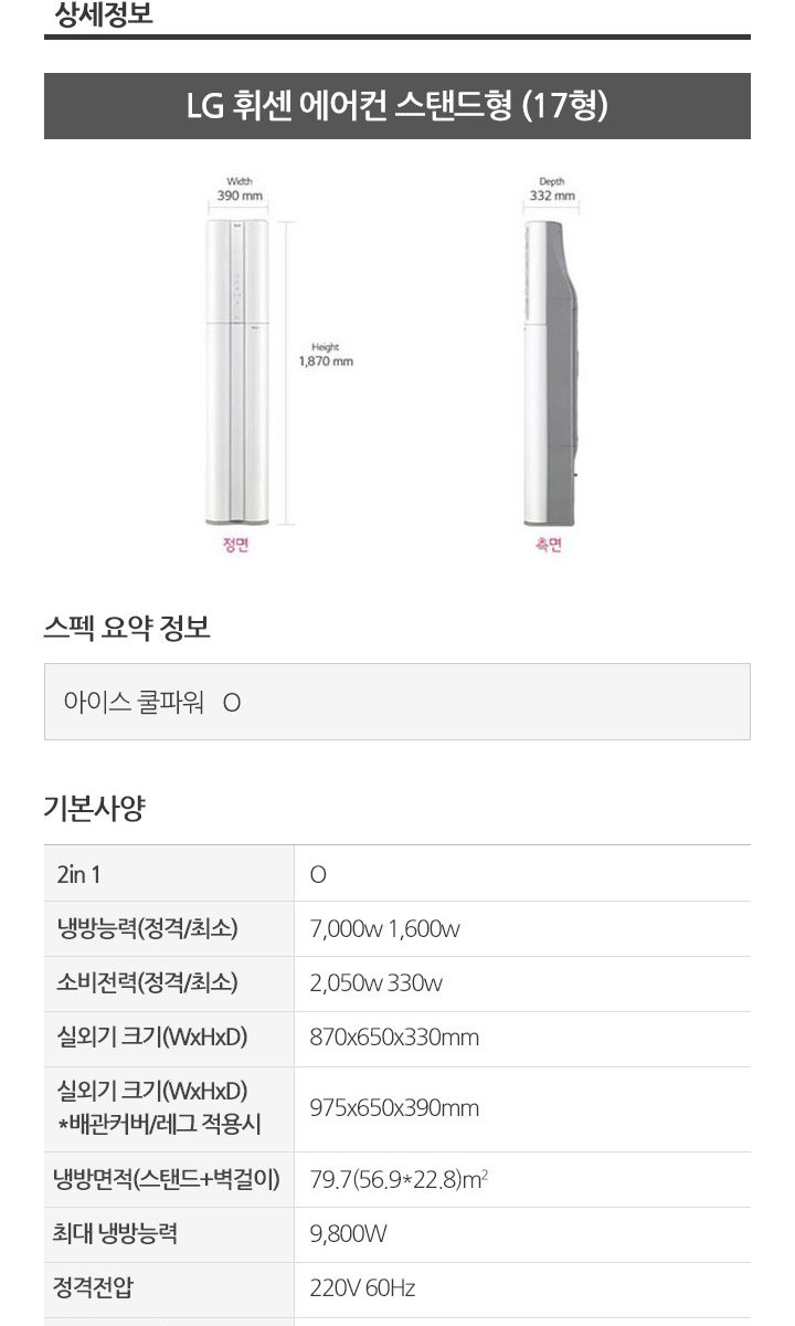 | 크기, 형태 (실외기 포함) | -실내기크기(WxHxD) : 390x1870x332mm (스탠드형) 857x348x190mm (벽걸이형) -실외기크기(WxHxD) : 870 x 800 x 320 mm |