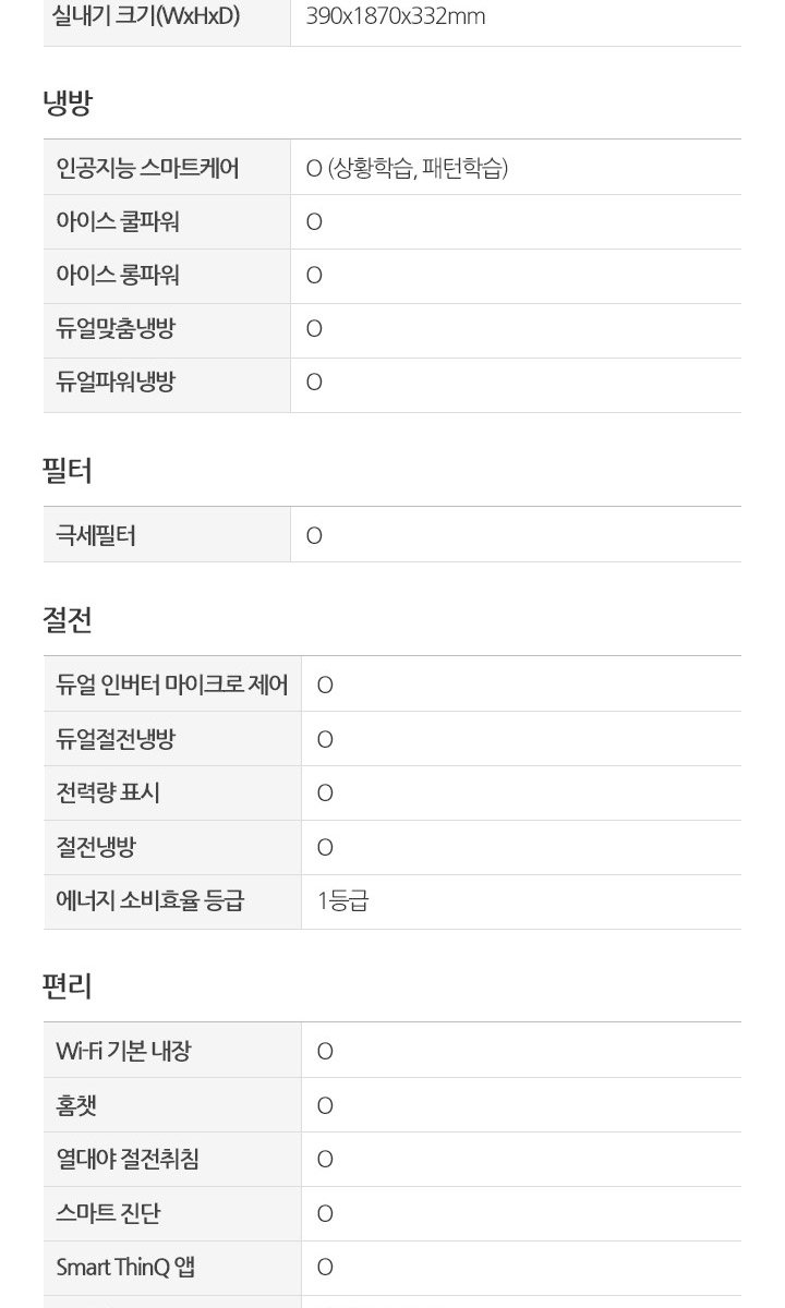 ├ 크기: 실내기크기(WxHxD) - 390x1870x332mm