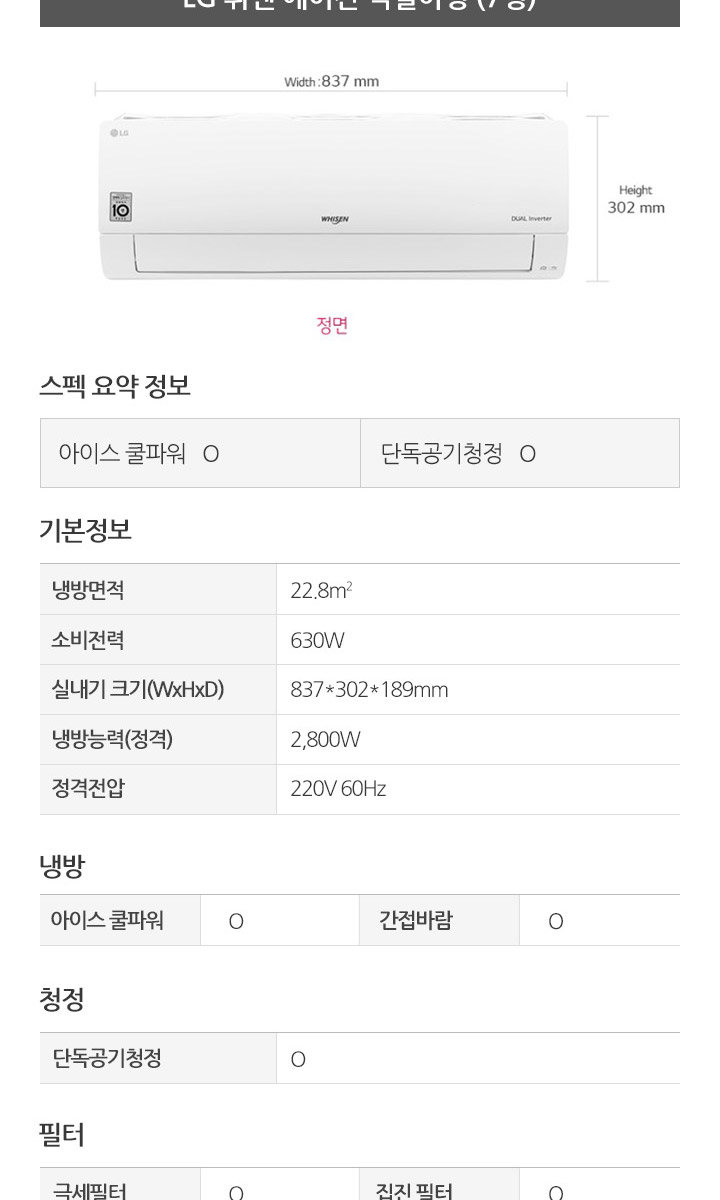 ├ 소비전력: 스탠드형 2050W(최소 330W), 벽걸이형 630W