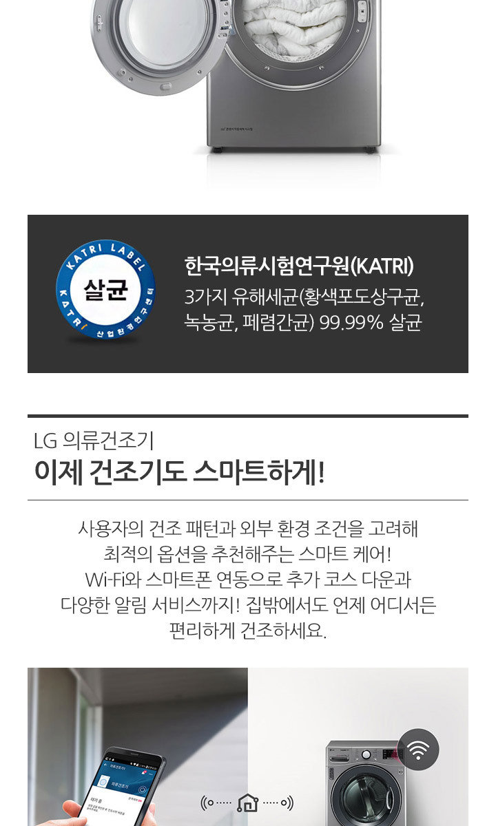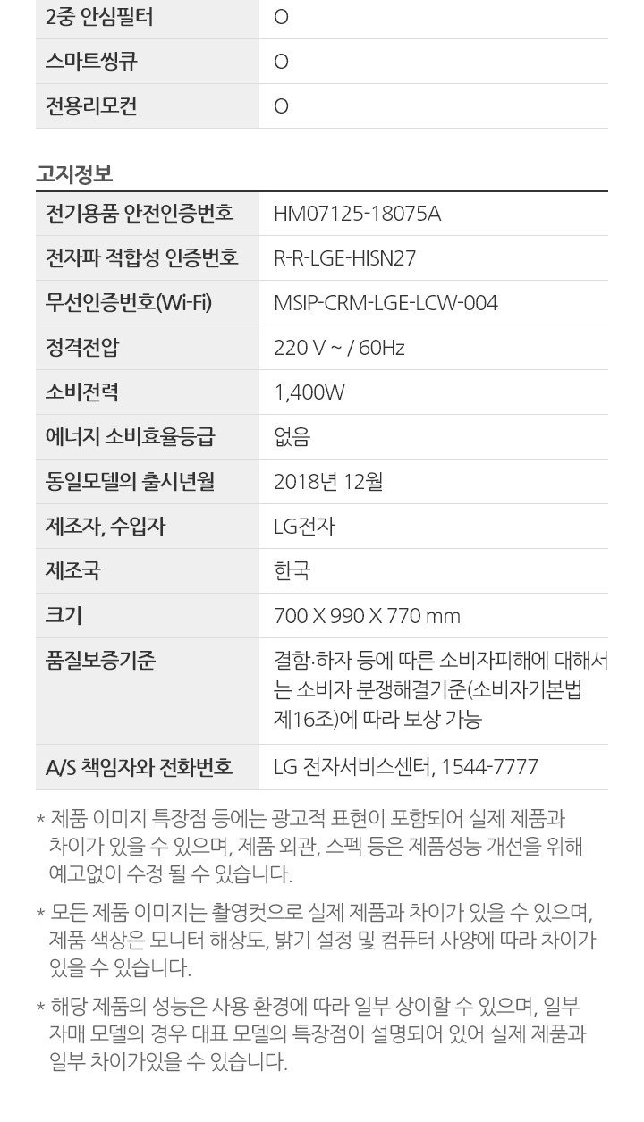 | KC 인증정보 (「전기용품 및 생활용품 안전관리법」에 따른 안전인증ㆍ안전확인ㆍ공급자적합성확인대상제품 및 「전파법」에 따른 적합인증ㆍ적합등록 대상 기자재에 한함) | 의류건조기 : HM07125-18075A / R-REM-LGE-JU27WC 드럼세탁기 : SM07003-9001 / MSIP-REM-LGE-VC27DE |