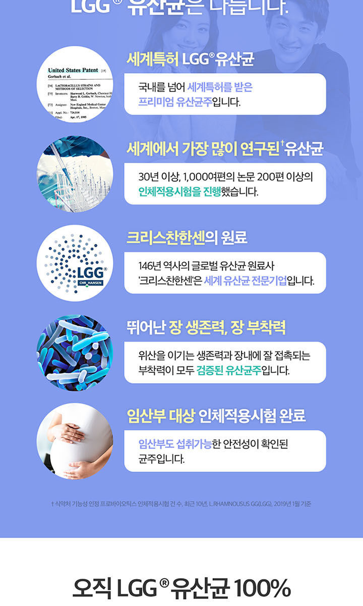| 원재료명 및 함량 (「농수산물의 원산지 표시 등에 관한 법률」에 따른 원산지 표시 포함) | 락토바실러스 람노서스 GG [Lactobacillus rhamnosus GG (LGG®), 설탕, 말토덱스트린, L-아스코브산나트륨], 이눌린{치커리추출물(벨기에 · 칠레)}, 스테아린산마그네슘, 이산화규소 [캡슐기제] 히드록시프로필메틸셀룰로스, 이산화티타늄(착색료) |