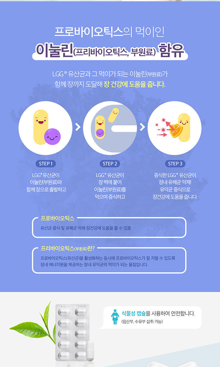 락토바실러스 람노서스 GG [Lactobacillus rhamnosus GG (LGG®), 설탕, 말토덱스트린, L-아스코브산나트륨], 이눌린{치커리추출물(벨기에 · 칠레)}, 스테아린산마그네슘, 이산화규소 [캡슐기제] 히드록시프로필메틸셀룰로스, 이산화티타늄(착색료)